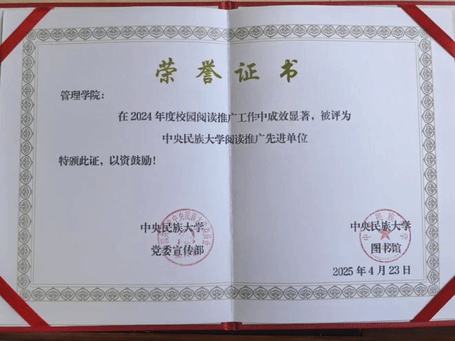 从“百秒十课万次”到“一路两人三关”,管院学子在学习过程中有共鸣、能共情,继而创新实践思想根基。未来,学院将继续努力开展更多内容丰富、形式多样的读书活动,为培养“厚基础、宽视野、重创新”的高素质人才、推进中华民族共同体建设贡献民大智慧。 今天是“世界读书日”,希望越来越多的师生积极响应全民阅读号召,把读书作为人生“刚需”,不断提升自身的文化素养和综合素质!